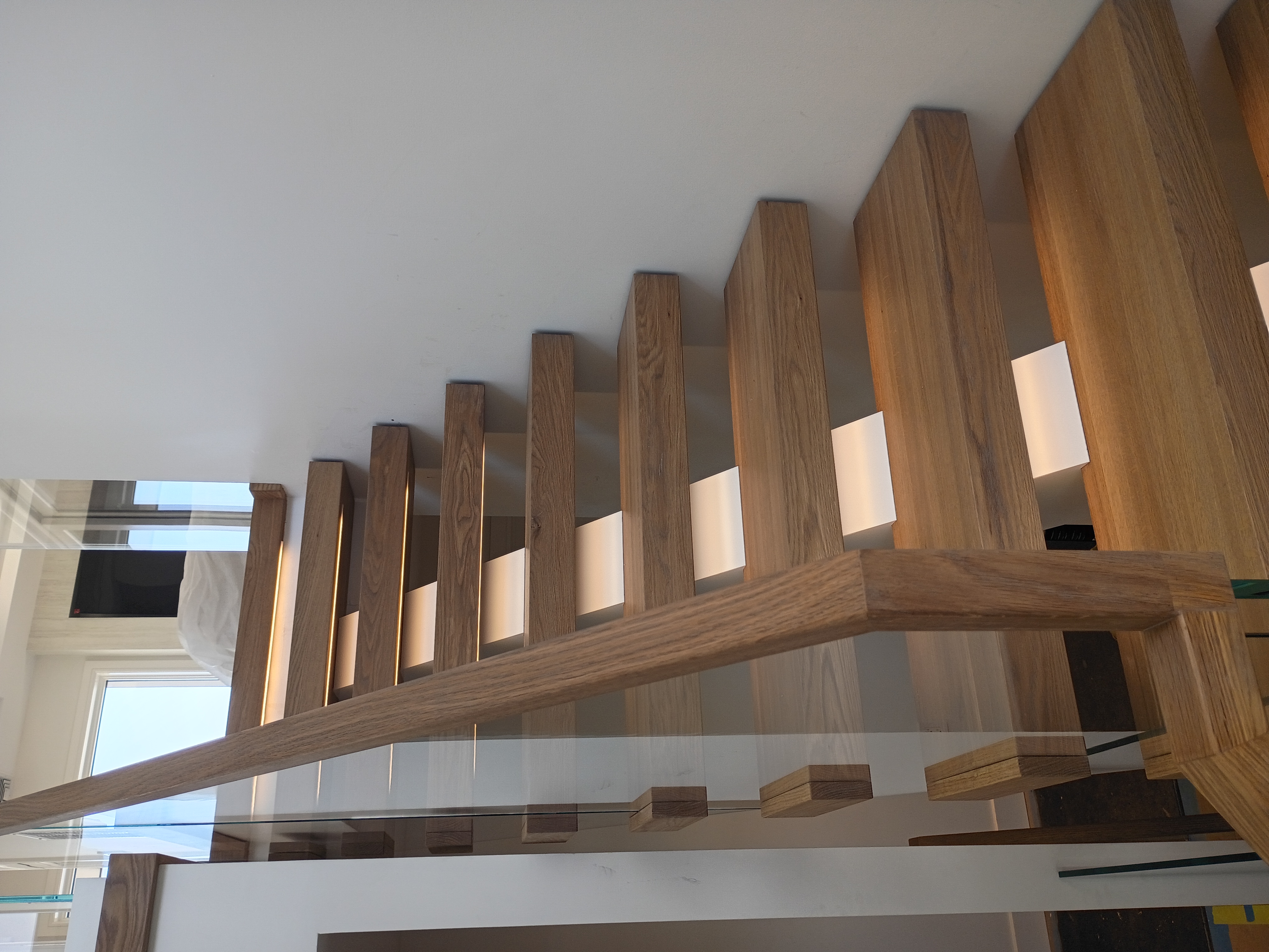L-shaped floating staircase in natural white oak with frameless glass balustrade. A stunning centerpiece for a luxury open-concept living room with herringbone hardwood floors and linear fireplace.