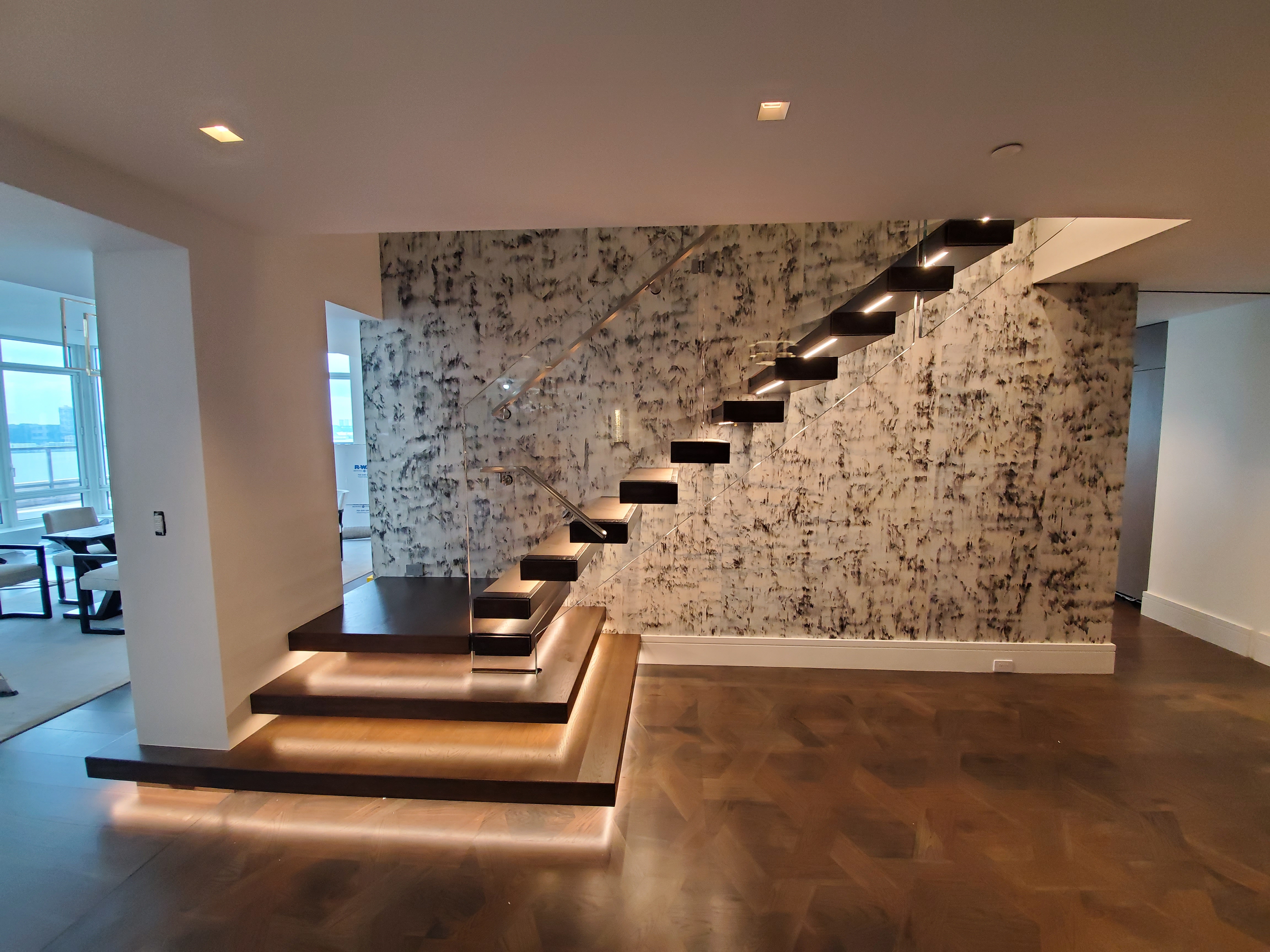 Dramatic cantilever staircase with dark-stained floating treads and integrated LED under-lighting. Frameless glass balustrade with stainless handrail against a sculptural textured accent wall.
