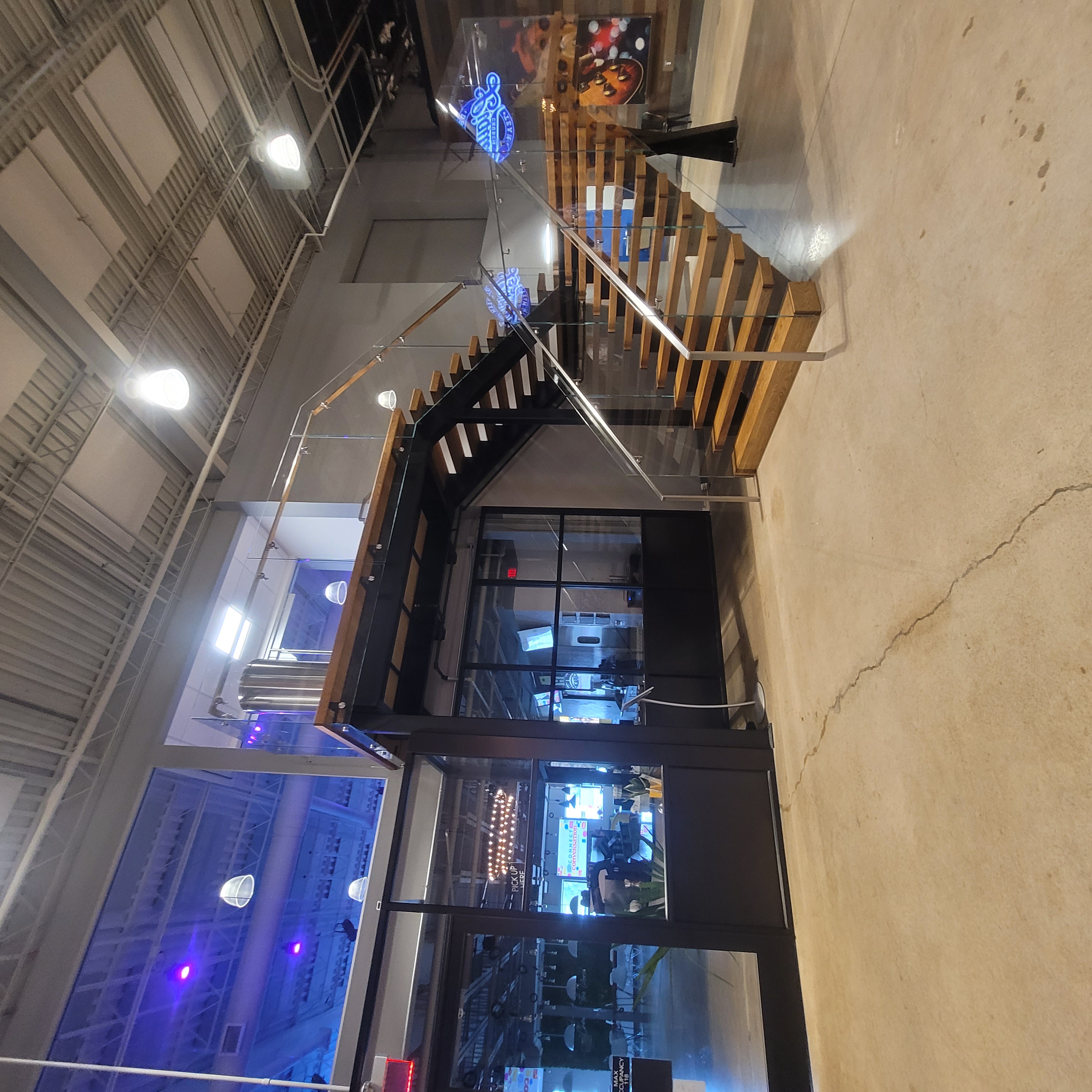 Industrial switchback staircase with natural wood treads on a heavy black steel structure. Frameless glass balustrade in a commercial venue with exposed concrete and dramatic night lighting.